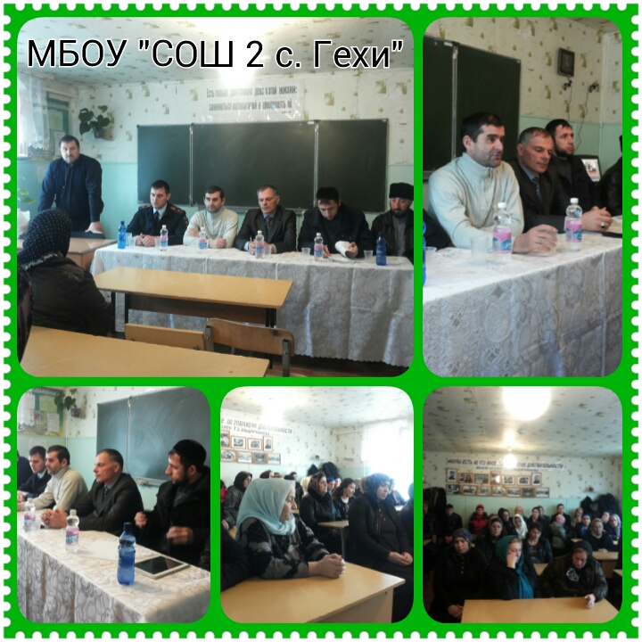 07.02.2015В МБОУ СОШ №2 с. Гехи состоялось общешкольное родительское собрание на тему: "Духовно-нравственное воспитание подрастающего поколения" присутствии: Глава администарации с. Гехи- Шатаханов М.М., директор школы- Бисултанов И.Ю., член совета по культуре при главе Республики- Альтемиров А.М., зам. дир. по ДНВ СОШ №1 с. Гехи- Ганаев Адам, зам. дир. по ДНВ СОШ №2 с. Гехи- Таштамиров Юсуп, участковый- Эльснукаев Сайд-Селам.