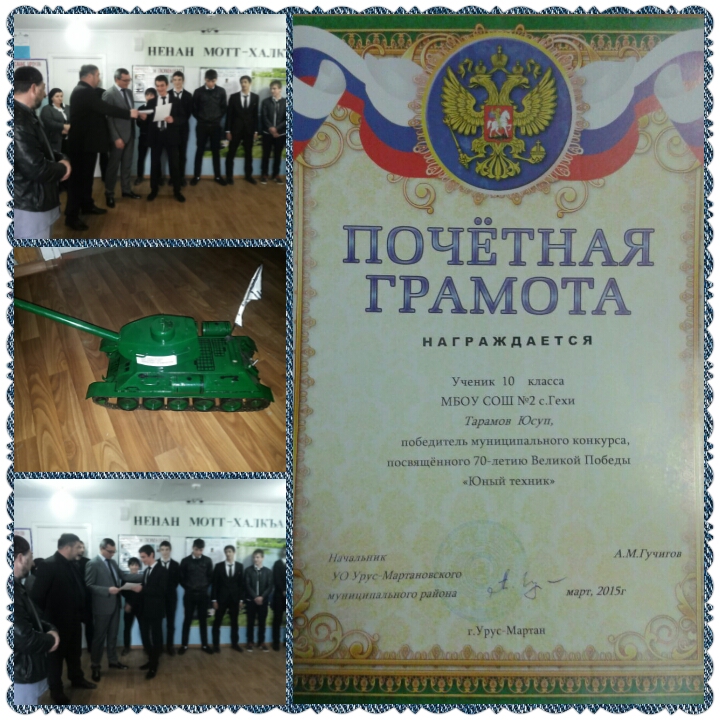 Ученик 10 класса МБОУ СОШ №2 с. Гехи Тарамов Юсуп, победитель муниципального конкурса, посвященного 70-летию Великой Победы "Юный техник"